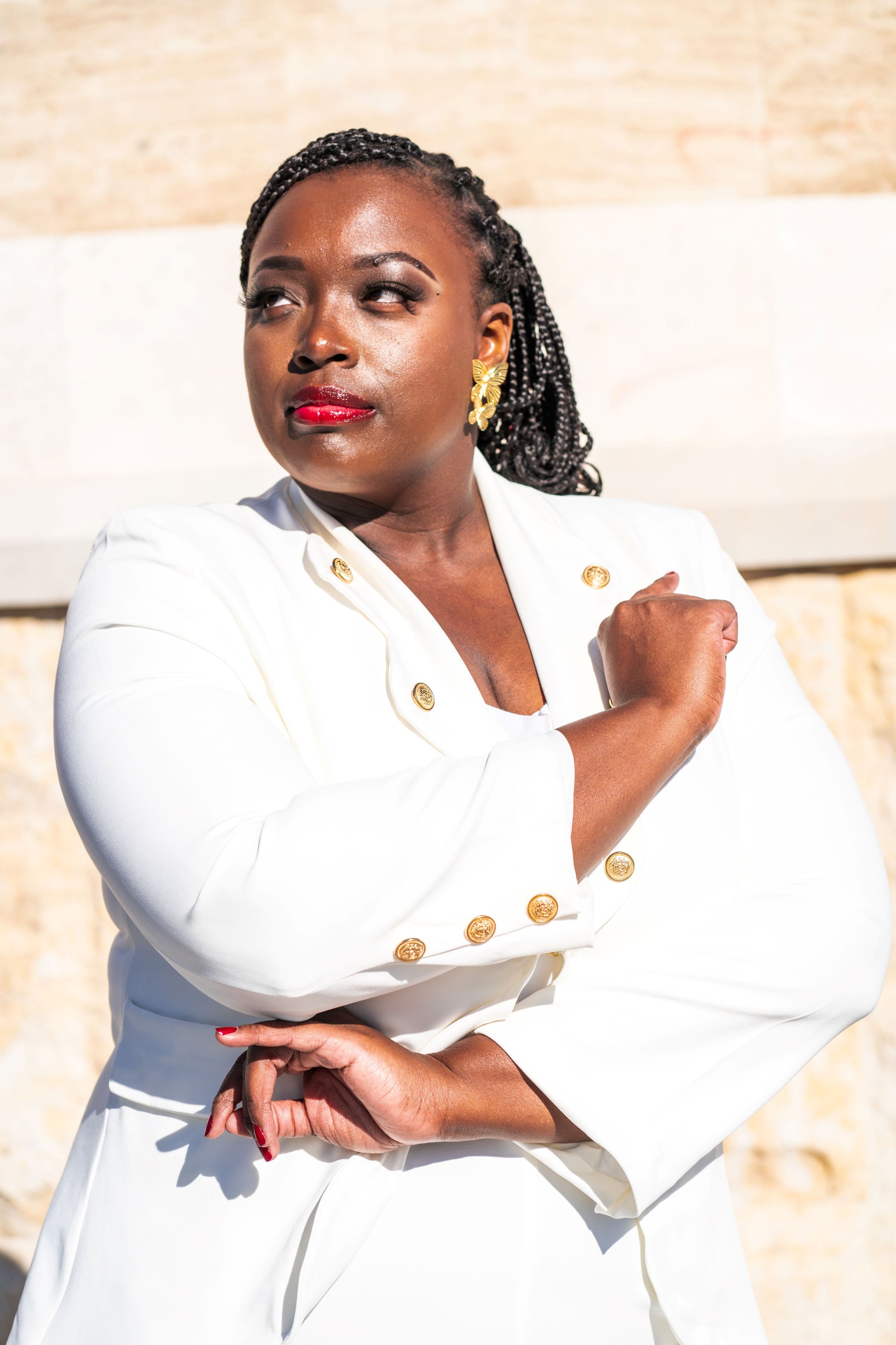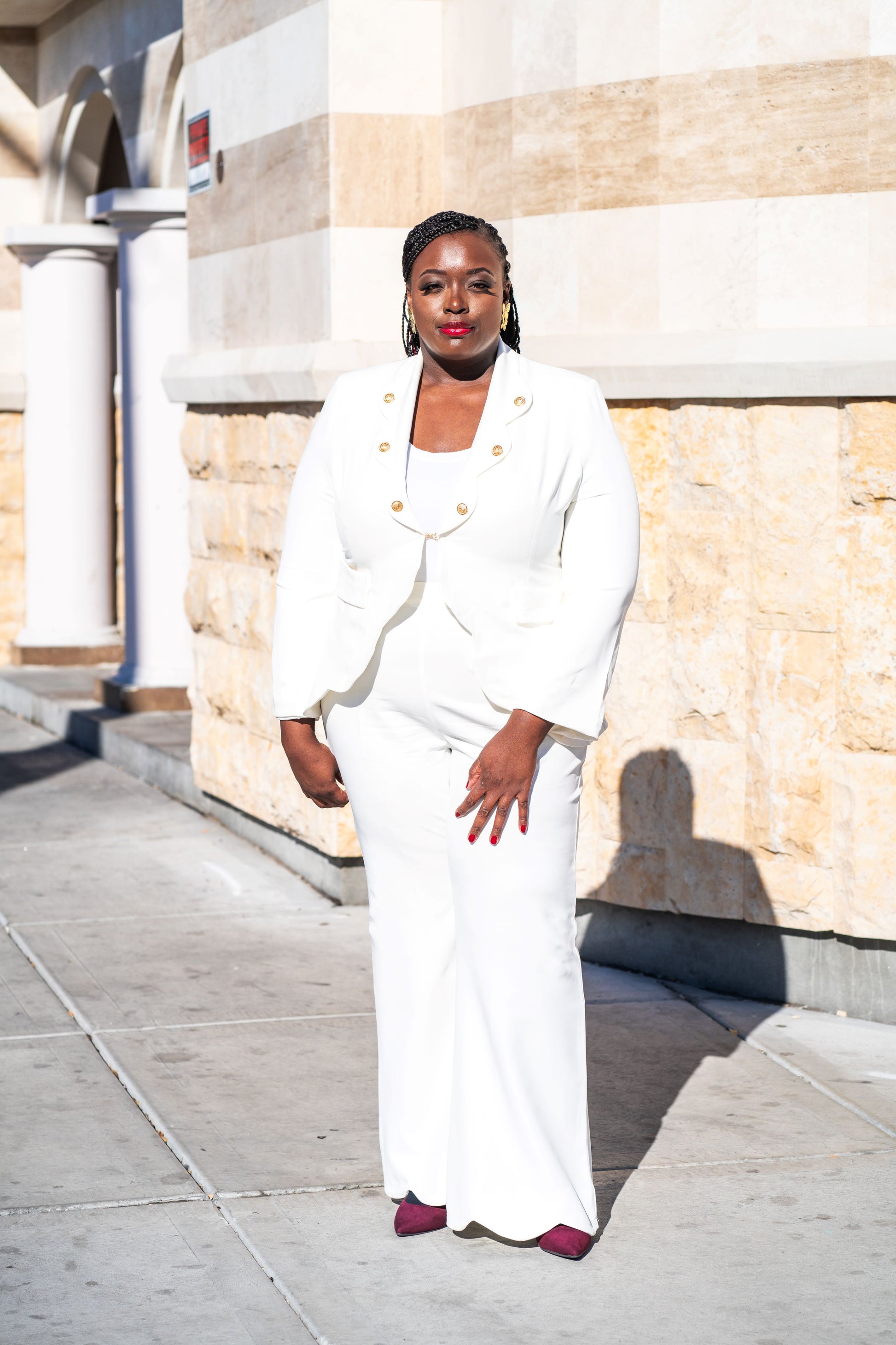 LONG SLEEVE JACKET BLAZER SUIT SET PLUS SIZE: 95% POLYESTER, 5% SPANDEX LINING: 100% POLYESTER - 2 PC SET - BUTTON DETAIL ON BLAZER - LONG SLEEVE - POCKETS - FLARE IN PANTS