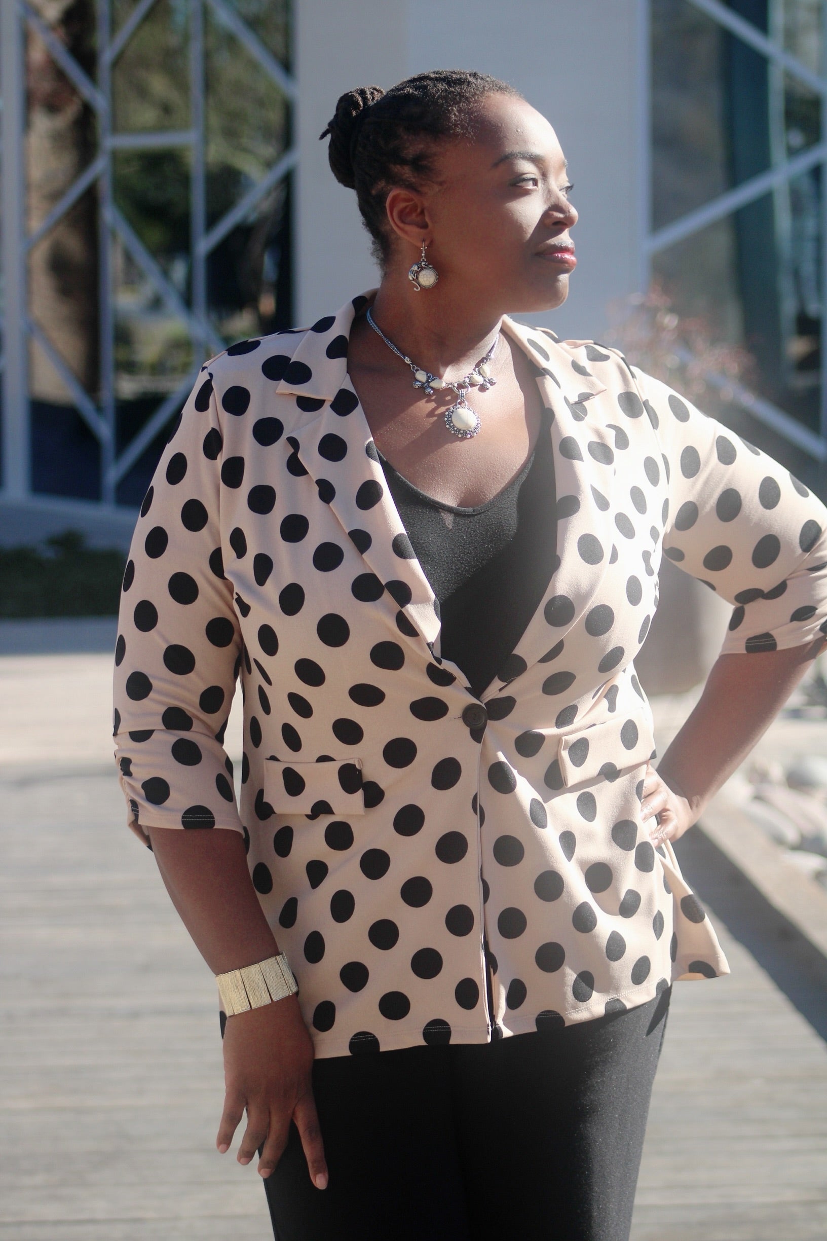 Tan blazer with black polka dots. This blazer is lightweight and unlined perfect for spring and summer. Only plus size available.
