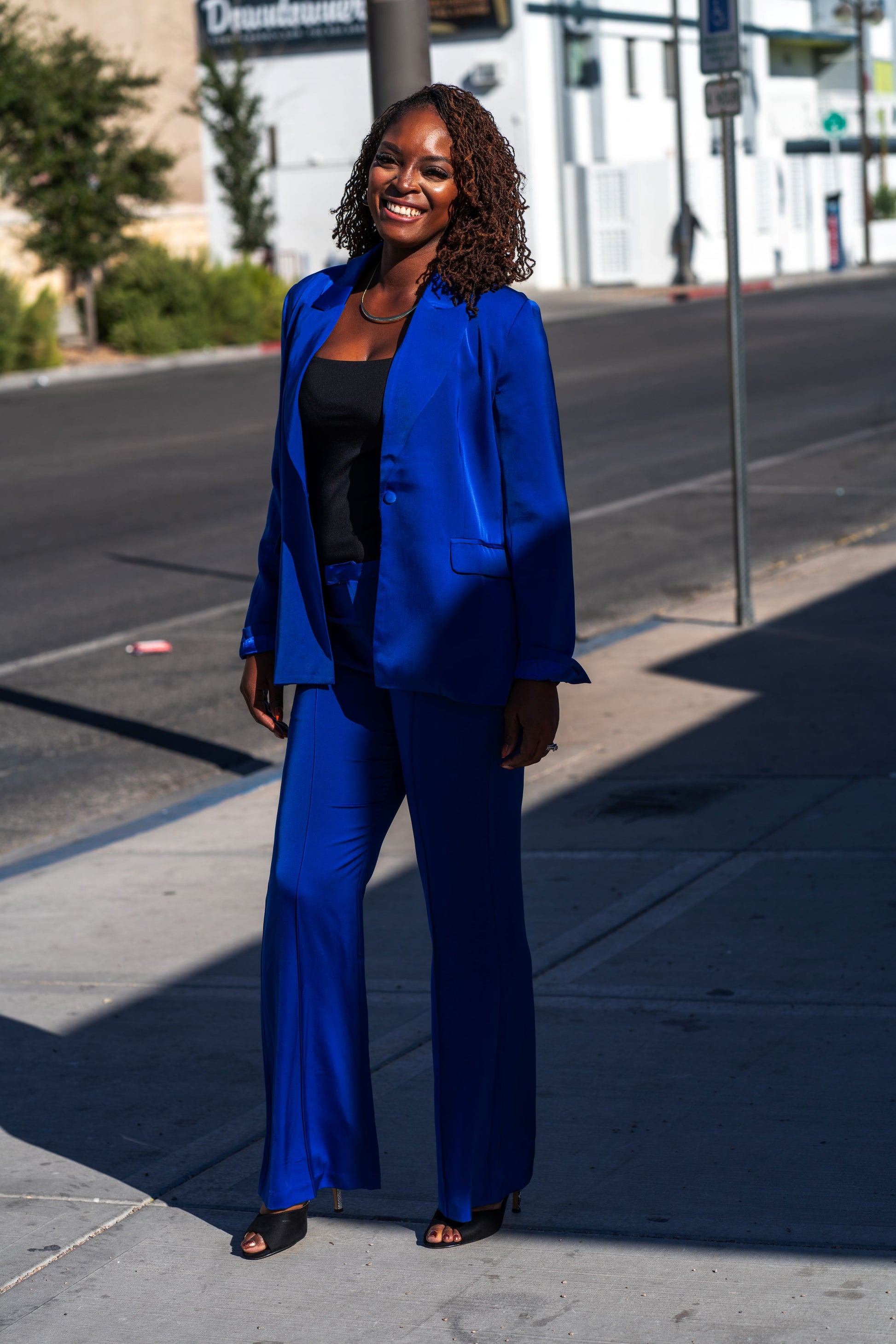 Blazer: Tailored Satin Blazer. This dressy blazer jacket features notch lapel, single button closure, flap pockets, and full lining.